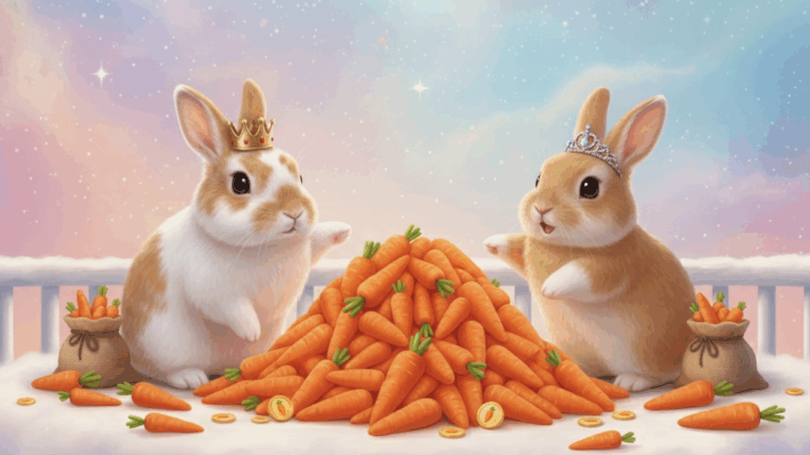 宇宙のどこか、星々がきらめくビロードの絨毯に、ひときわ優しく輝く星がありました。その名は「ふわふわ星」。大地はマシュマロのように柔らかく、川にはイチゴミルクが流れ、そこに住むうさぎたちの毛並みと同じくらい、何もかもがふわふわな星です。 この星の通貨は、甘くて美味しい「ニンジン」。うさぎたちはニンジンを育て、ニンジンで買い物をし、将来のためにニンジンを蓄えるのでした。 そんな穏やかなある日の午後。ふ […]
