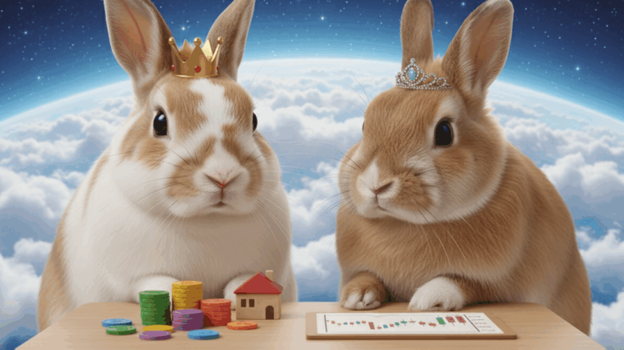 宇宙のどこかにある、何もかもがふわふわな惑星「ふわふわ星」。そこに住むうさぎたちは、毎日をのんびりと、そして幸せに暮らしていました。この星の若き王、てち王は、今日も自慢の長い耳を揺らしながら、書斎で経済新聞を読んでいます。その傍らでは、妹のちろ姫がぴょんぴょんと跳ね回り、おやつの干し草をねだるタイミングをうかがっていました。 そんな平和な昼下がり、一人の訪問者がゆっくりと王宮の庭に現れました。お隣 […]