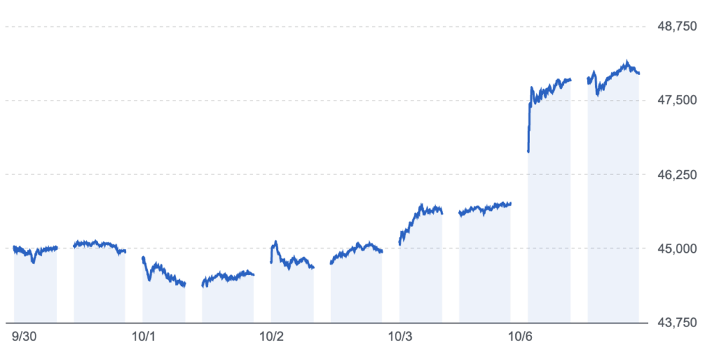 週明け10月6日の東京株式市場は、前週末比で一時2,000円を超える大幅な上昇となり、日経平均株価はあっさりと4万7,000円の大台を突破しました。この急騰の最大の要因は、10月4日に投開票された自民党総裁選の結果にあります。