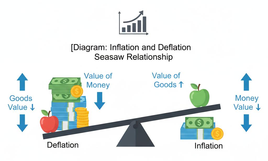 まず、基本中の基本から押さえましょう。インフレとデフレは、シーソーのような関係です。
