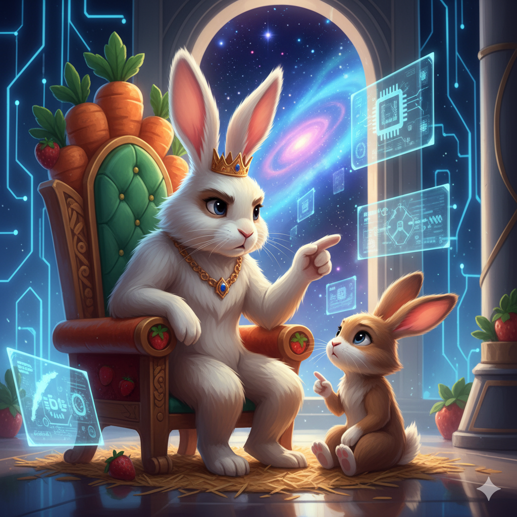 ふわふわ星の王宮は、今日も平和そのもの。 ニンジンとイチゴでできた玉座にどっしりと構えるのは、この星の王、T。その足元では、プリンセスのCが干し草をもしゃもしゃと食べながら、ぴょんぴょん跳ねていた。