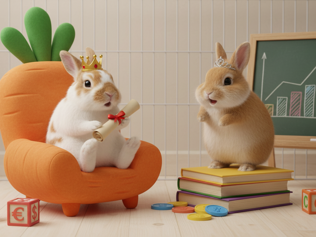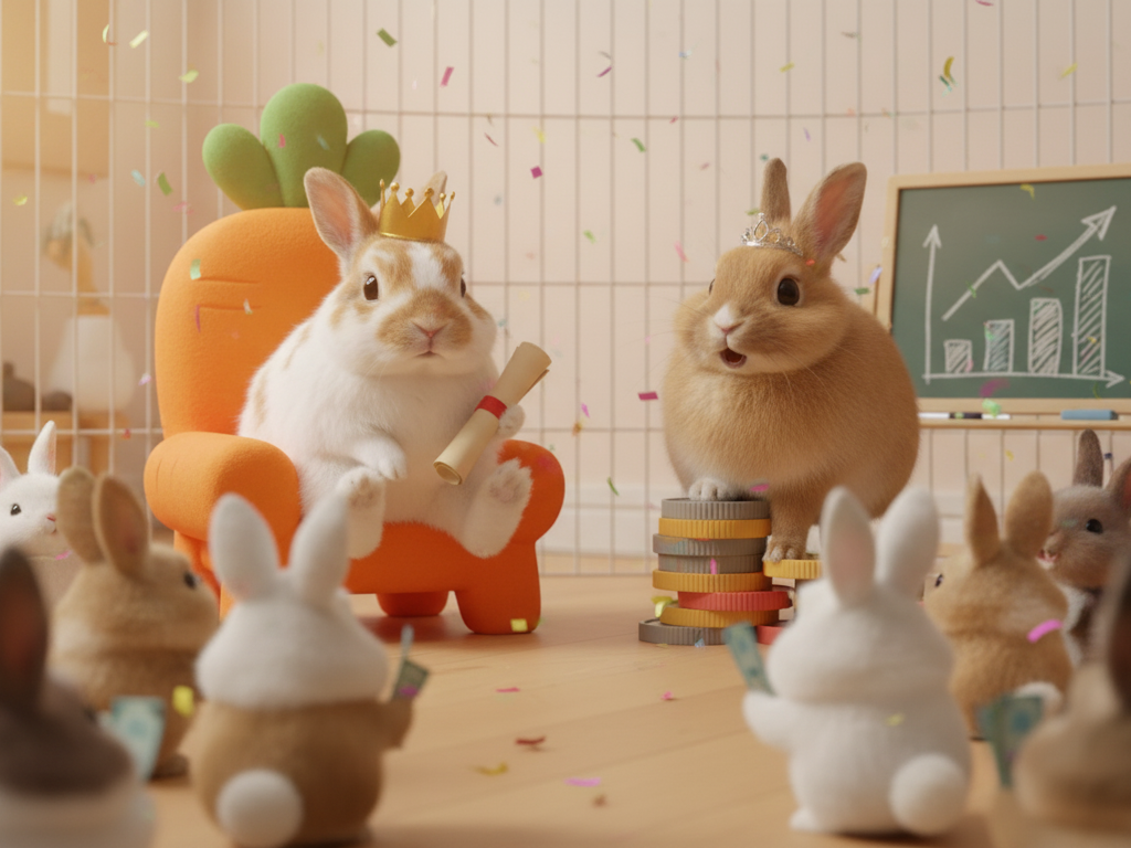 ここは宇宙のどこかにある、すべてがふわふわな惑星「ふわふわ星」。この星の玉座では、威厳あふれる白と茶色のうさぎの王様「T」が、巨大なニンジンのクッションにもたれていました。そこへ、元気いっぱいの茶色いプリンセス「C」が、ぴょんぴょんと駆け寄ってきます。