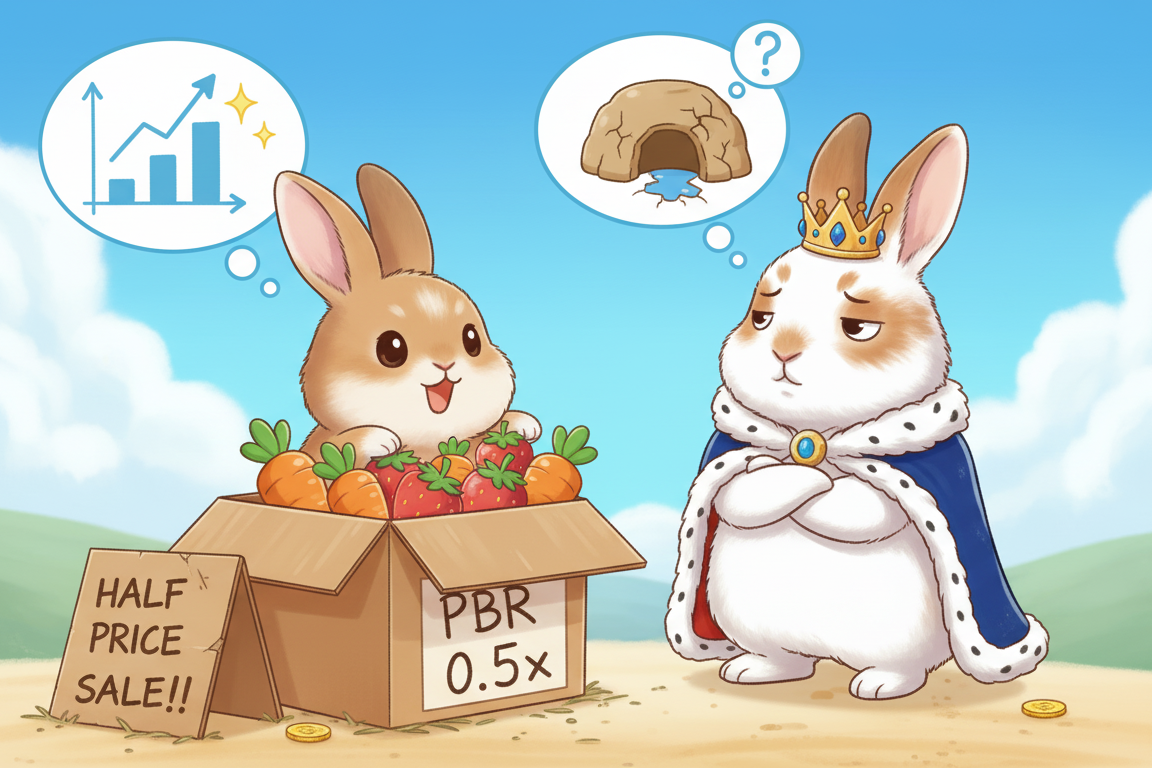 てち王: その通り! さすがはプリンセス、理解が早いのう。では、ちろ姫よ。もしPBRが「1倍を割れている」、例えば0.5倍だったらどういう意味になるかな?