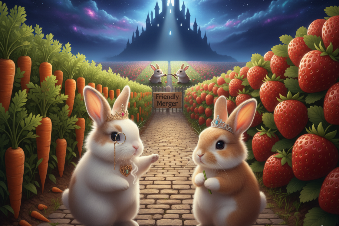 てち王: そんなところだ。例えば、朕が隣のニンジン畑の主に「あなたの畑と朕のイチゴ畑を合体させて、もっと大きな農園にしませんか?」と相談して、相手も「ぜひ!」と賛成してくれた上で畑の権利を買い取るのが「友好的TOB」じゃ。お互いの強みを活かして、もっと美味しい野菜が作れるようになるかもしれん。