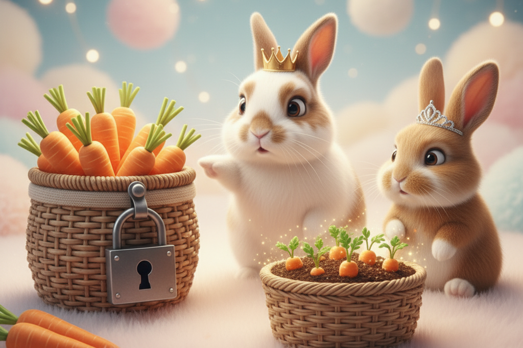 てち王: 「まず大切なのは『守りのカゴ』じゃ。ここには、いつでも使えるニンジンを準備しておく。姫が急にお腹を空かせたり、お城の屋根が壊れても、すぐに直せるだけのニンジンじゃな。これを『生活防衛資金』と呼ぶ。いざという時のための、安心の貯ニンジンじゃ」