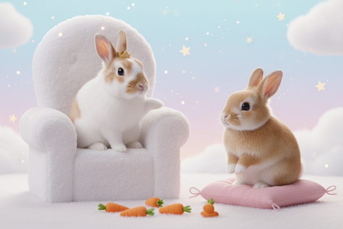 宇宙のどこかにある、何もかもが“ふわふわ”な惑星、その名も「ふわふわ星」。この星では、立派なニンジンが通貨として流通しています。今日の主役は、この星のプリンセス「ちろ姫」。おやつの干し草をもしゃもしゃしながら、何やら考え込んでいるようです。