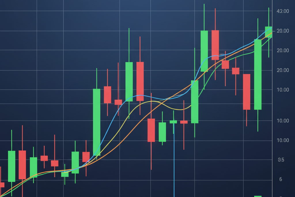 一定期間(日、週、月など)の値動きを一本の棒で表したもの。「実体」と呼ばれる四角い部分で始値と終値、「ヒゲ」と呼ばれる線で高値と安値を示します。始値より終値が高いものが「陽線」、低いものが「陰線」です。 - 移動平均線 (Moving Average)