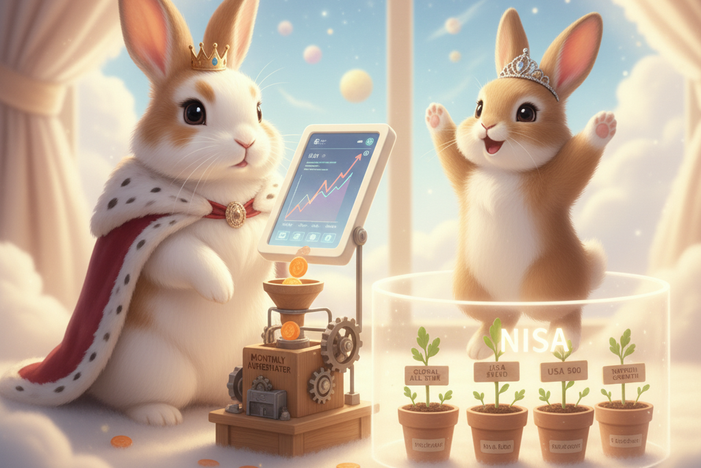 てち王: 「最後に『4. 積立設定』じゃ。これは、ちろ姫のニンジン貯金箱から、毎月決まった日に、決まった本数のニンジンを、自動で畑に植えに行ってくれる『自動ニンジン植え機』をセットするようなものじゃ。例えば、『毎月1日に、ニンジンを3本植える』と一度設定してしまえば、あとはちろ姫がぴょんぴょん遊んでいても、寝ていても、機械が勝手に未来の畑を耕してくれる。これを『ドルコスト平均法』と言う」
