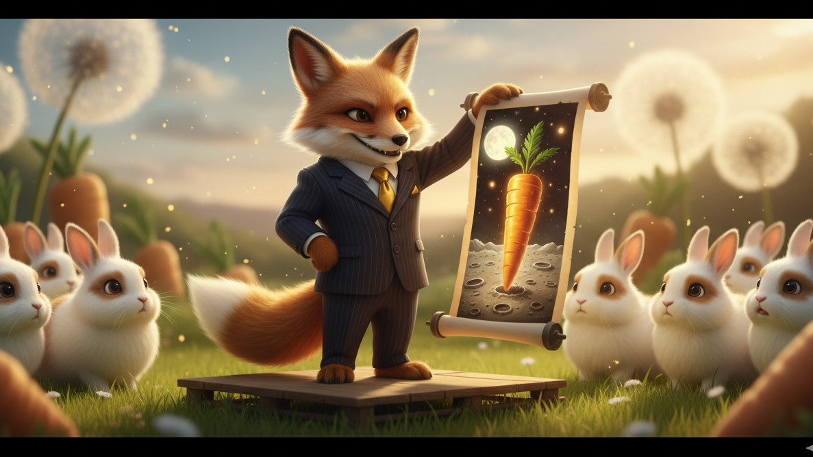 コンコン・フォックス: 「これこそが、我がコンコン・エンタープライズが独占入手した超A級の投資情報! 『月面産プレミアムキャロット』への投資だコン! 月の特殊な重力とミネラルによって育まれたこのニンジンは、地上のもんとは比べ物にならない栄養価と希少価値を持つ! このプロジェクトに君たちのニンジンを投資すれば、収穫の暁には価値はうなぎのぼり…いや、うさぎ跳び間違いなしコン! このチャンスは今だけ! 限定100口! さあ、未来の億万長者になるのは誰だコン!」