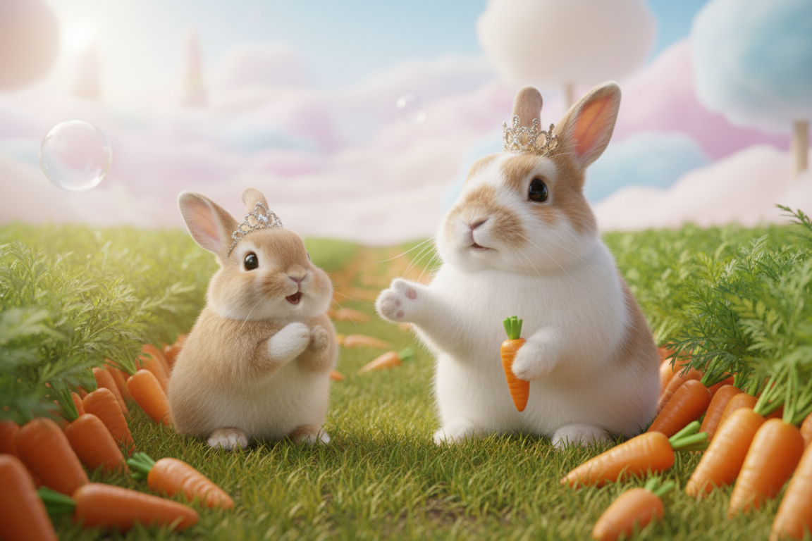 宇宙のどこか、なにもかもが「ふわふわ」でできている惑星、ふわふわ星。 この星では、王様もお姫様も、みんなフワッフワのうさぎです。 通貨はなんと「ニンジン」。今日もこの平和な星で、経済と金融をめぐる、兄妹の可愛らしい(でも、とても大切な)お話が始まるようです。
