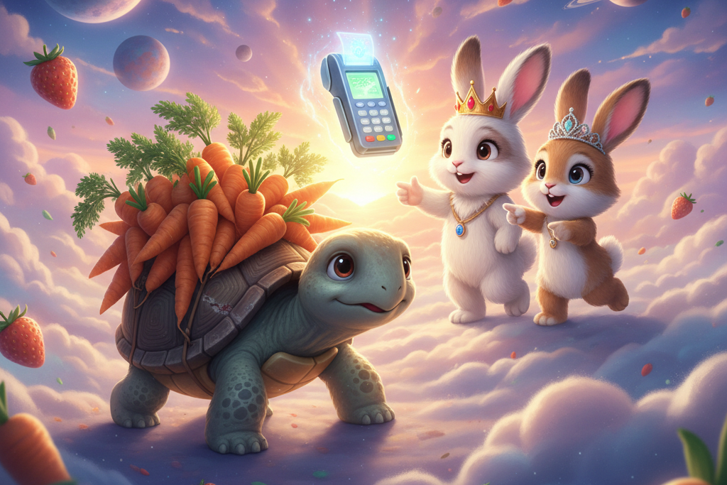 ノンビリ・タートル:「やあ、てち王さん、ちろ姫ちゃん。賑やかですな。おや、ちろ姫ちゃんが持っているのは、最近噂の『Pota-Potaカード』ですかい? わしにはどうも、あんな板きれで買いものできるなんて、信じられなくてのぅ…。やっぱり、お金はこのニンジンみたいに、ちゃんと手で触れるのが一番じゃ。」